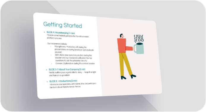 Getting Started ● SLIDE 4: Housekeeping (1 min) Provide some helpful guidance for the virtual event platform you use. Our recommendations: ○ Microphones: Mandatory off during the presentation, on during breakout room (network session) ○ Q&A: Send your questions on chat during the session and our moderator will select the top questions to ask the presenter directly ○ Camera: Optional on during the content session ● SLIDE 5-7: About Your Company (2 min) Briefly outline your organization’s story — keep it as light and human as possible! ● SLIDE 6: Introductions (2 min) Introduce your speakers, with name, title, and perhaps a fun fact about them to break the ice.