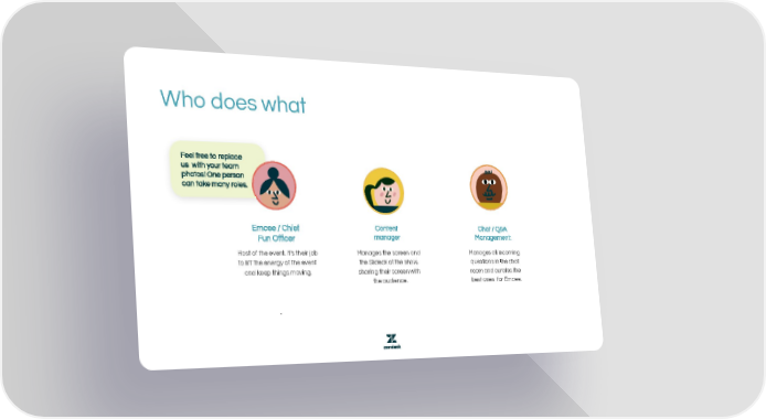 Who does what Feel free to replace us with your team photos! One person can take many roles. Content Chat / Q&A Emcee / Chief manager Management: Fun Officer Host of the event. It’s their job Manages the screen and Manages all incoming to lift the energy of the event the Slideck of the show, questions in the chat and keep things moving. sharing their screen with room and curates the the audience. best ones for Emcee. .