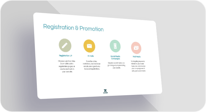 Registration & Promotion Registration LP E-mails Social Media Paid Media Campaigns By targeting keywords Choose a platform like Save the dates, Organic social media can related to your event Zoom with built in invitations, and reminder go a long way in promoting topic, you can broaden registration pages, or emails, are a great way your events. your campaign reach create and host on to boost registrations. with paid social media. your own site.