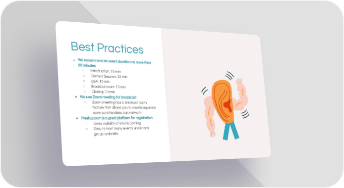 Best Practices ● We recommend an event duration no more than 60 minutes ○ Introduction: 10 min ○ Content Session: 20 min ○ Q&A: 10 min ○ Breakout room: 10 min ○ Closing: 10 min ● We use Zoom meeting for broadcast ○ Zoom meeting has a breakout room feature that allows you to create separate room so attendees can network ● Meetup.com is a great platform for registration ○ Gives visibility of who is coming ○ Easy to host many events under one group umbrella