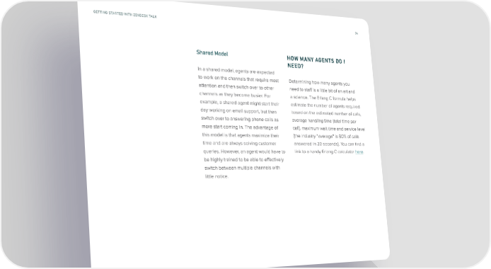 GETTING STARTED WITH ZENDESK TALK 34 Shared Model HOW MANY AGENTS DO I NEED? In a shared model, agents are expected to work on the channels that require most Determining how many agents you attention and then switch over to other need to staff is a little bit of an art and channels as they become busier. For a science. The Erlang C formula helps example, a shared agent might start their estimate the number of agents required day working on email support, but then based on the estimated number of calls, switch over to answering phone calls as average handling time (total time per more start coming in. The advantage of call), maximum wait time and service level this model is that agents maximize their (the industry “average” is 80% of calls time and are always solving customer answered in 20 seconds). You can find a queries. However, an agent would have to link to a handy Erlang C calculator here. be highly trained to be able to effectively switch between multiple channels with little notice.