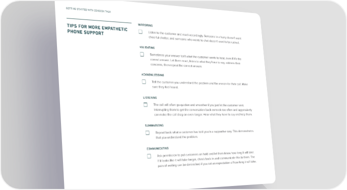 GETTING STARTED WITH ZENDESK TALK MIRRORING TIPS FOR MORE EMPATHETIC Listen to the customer and react accordingly. Someone in a hurry doesn’t want PHONE SUPPORT cheerful chatter, and someone who wants to chat doesn’t want to be rushed. VALIDATING Sometimes your answer isn’t what the customer wants to hear, even if it’s the correct answer. Let them react, listen to what they have to say, address their concerns, then repeat the correct answer. ACKNOWLEDGING Tell the customer you understand the problem and the reason for their call. Make sure they feel heard. LISTENING The call will often go quicker and smoother if you just let the customer vent. Interrupting them to get the conversation back on track too often and aggressively can make the call drag on even longer. Hear what they have to say and help them. SUMMARIZING Repeat back what a customer has told you in a supportive way. This demonstrates that you understand the problem. COMMUNICATING Ask permission to put customers on hold and let them know how long it will take. If it looks like it will take longer, check back in and communicate this to them. The pain of waiting can be diminished if you set an expectation of how long it will take.
