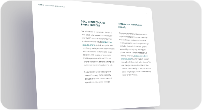 GETTING STARTED WITH ZENDESK TALK 5 GOAL 1: INTRODUCING Introduce your phone number PHONE SUPPORT gradually We talk to lots of companies that start Displaying a phone number prominently with email only support, but eventually on your website can increase credibility find that it’s important to provide their with customers and assure them that customers with a way to contact them help is just a phone call away, but it might over the phone. In fact, we spoke with be better to slowly “ease into” phone one fast-growing e-commerce company support by strategically sharing your with resourceful customers so eager phone number. DonorsChoose.org, a to speak with someone for support leading nonprofit, first started out with that they uncovered the CEO’s cell phone support by sharing their support phone number on a financial filing and line only with their high-value donors. You published it online for others to call. can also put a support number on the specific sections of your help center that If your goal is to introduce phone cover subjects you know customers may support in a way that’s minimally need to talk through. disruptive to your current support operations, here are a few tips:
