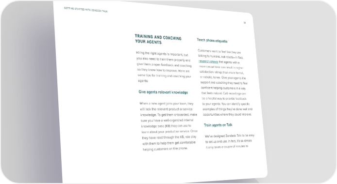 GETTING STARTED WITH ZENDESK TALK 30 TRAINING AND COACHING Teach phone etiquette YOUR AGENTS Customers want to feel like they are Hiring the right agents is important, but talking to humans, not robots—in fact, you also need to train them properly and research shows that agents with a give them proper feedback and coaching more casual tone can result in higher so they know how to improve. Here are satisfaction ratings than more formal, some tips for training and coaching your or robotic, tones. Give your agents the agents: support and coaching they need to feel confident helping customers in a way Give agents relevant knowledge that feels natural. Call recordings can be a helpful way to provide feedback When a new agent joins your team, they to your agents. You can identify specific will lack the relevant product or service examples of things they’ve done well and knowledge. To get them onboarded, make opportunities where they could improve. sure you have a well-organized internal knowledge base (KB) they can use to Train agents on Talk learn about your product or service. Once they have read through the KB, role play We’ve designed Zendesk Talk to be easy with them to help them get comfortable to set up and use. In fact, it’s so simple helping customers on the phone. it only takes a couple of minutes to