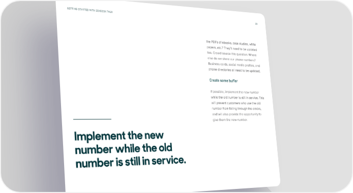 GETTING STARTED WITH ZENDESK TALK 20 the PDFs of ebooks, case studies, white papers, etc.? They’ll need to be updated too. Crowd source this question: Where else do we share our phone numbers? Business cards, social media profiles, and phone directories all need to be updated. Create some buffer If possible, implement the new number while the old number is still in service. This will prevent customers who use the old number from falling through the cracks, and will also provide the opportunity to give them the new number. Implement the new number while the old number is still in service.