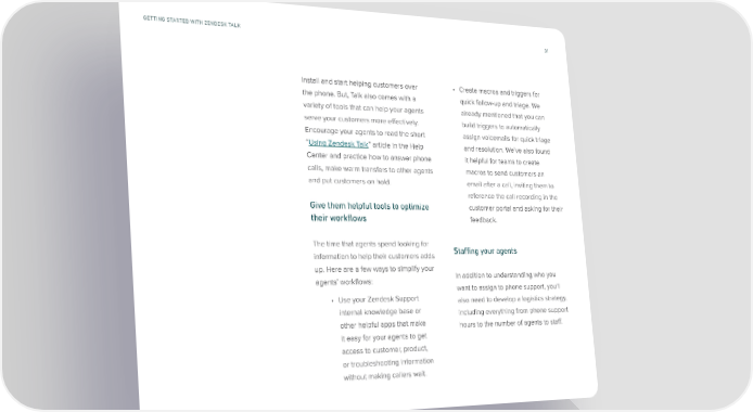 GETTING STARTED WITH ZENDESK TALK 31 • Create macros and triggers for install and start helping customers over the phone. But, Talk also comes with a quick follow-up and triage. We variety of tools that can help your agents already mentioned that you can serve your customers more effectively. build triggers to automatically Encourage your agents to read the short assign voicemails for quick triage “Using Zendesk Talk” article in the Help and resolution. We’ve also found Center and practice how to answer phone it helpful for teams to create calls, make warm transfers to other agents macros to send customers an and put customers on hold. email after a call, inviting them to reference the call recording in the Give them helpful tools to optimize customer portal and asking for their their workflows feedback. The time that agents spend looking for Staffing your agents information to help their customers adds up. Here are a few ways to simplify your agents’ workflows: In addition to understanding who you want to assign to phone support, you’ll • Use your Zendesk Support also need to develop a logistics strategy, internal knowledge base or including everything from phone support other helpful apps that make hours to the number of agents to staff. it easy for your agents to get access to customer, product, or troubleshooting information without making callers wait.