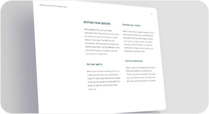 GETTING STARTED WITH ZENDESK TALK 26 SETTING YOUR QUEUES Consider your callers With Zendesk Talk, you can easily What is the phone support experience that determine how many and how long callers you’d like to provide your callers? Would will wait in the queue to talk to an agent. you prefer that they wait longer to reach Industry “averages” are 80% of calls a live agent, or wait a short time before answered in 20 seconds, but what works leaving a voicemail? Refer to customer best for your team may be different. Here satisfaction ratings or even reach out to are some things to consider to you set customers to get their take. your queue configuration: Continue optimizing Ask your agents Keep an eye on call queues and metrics Have they received feedback from any (find more details in the section on customers that they were waiting too “Measuring and Improving”). If you see, long? Or have they themselves noticed say, high levels of caller abandonment, anything that would be improved? Your you may need to shorten your queues. frontline agents could be your best resource.