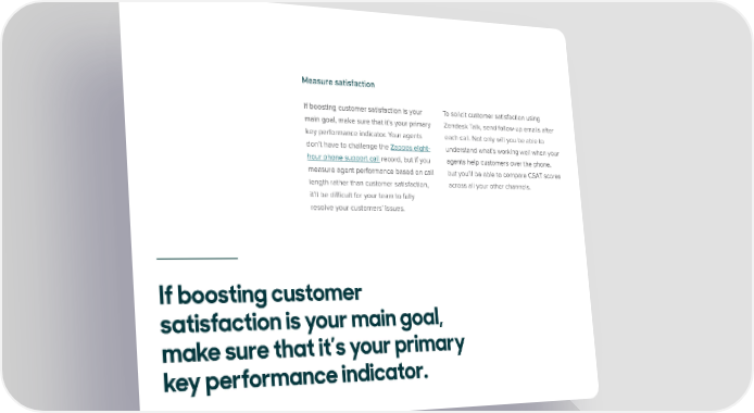 Measure satisfaction If boosting customer satisfaction is your To solicit customer satisfaction using main goal, make sure that it’s your primary Zendesk Talk, send follow-up emails after key performance indicator. Your agents each call. Not only will you be able to don’t have to challenge the Zappos eight- understand what’s working well when your hour phone support call record, but if you agents help customers over the phone, measure agent performance based on call but you’ll be able to compare CSAT scores length rather than customer satisfaction, across all your other channels. it’ll be difficult for your team to fully resolve your customers’ issues. If boosting customer satisfaction is your main goal, make sure that it’s your primary key performance indicator.
