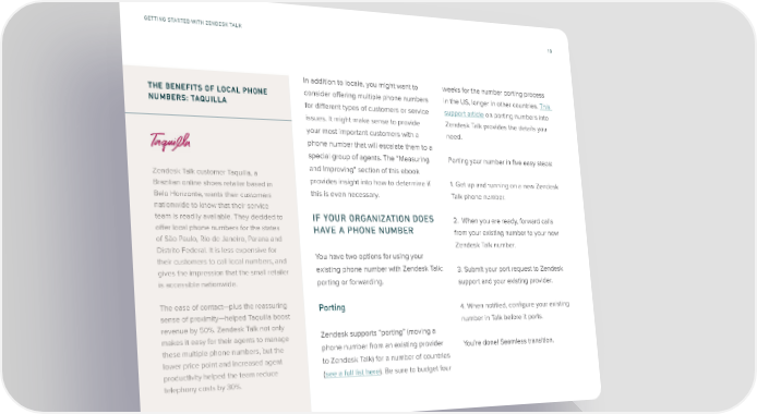GETTING STARTED WITH ZENDESK TALK 18 In addition to locale, you might want to weeks for the number porting process THE BENEFITS OF LOCAL PHONE consider offering multiple phone numbers in the US, longer in other countries. This NUMBERS: TAQUILLA for different types of customers or service support article on porting numbers into issues. It might make sense to provide Zendesk Talk provides the details you your most important customers with a need. phone number that will escalate them to a special group of agents. The “Measuring Porting your number in five easy steps: Zendesk Talk customer Taquilla, a and Improving” section of this ebook Brazilian online shoes retailer based in provides insight into how to determine if 1. Get up and running on a new Zendesk Belo Horizonte, wants their customers this is even necessary. Talk phone number. nationwide to know that their service team is readily available. They decided to IF YOUR ORGANIZATION DOES 2. When you are ready, forward calls offer local phone numbers for the states HAVE A PHONE NUMBER from your existing number to your new of São Paulo, Rio de Janeiro, Parana and Zendesk Talk number. Distrito Federal. It is less expensive for You have two options for using your their customers to call local numbers, and gives the impression that the small retailer existing phone number with Zendesk Talk: 3. Submit your port request to Zendesk is accessible nationwide. porting or forwarding. support and your existing provider. The ease of contact—plus the reassuring Porting 4. When notified, configure your existing sense of proximity—helped Taquilla boost revenue by 50%. Zendesk Talk not only number in Talk before it ports. makes it easy for their agents to manage Zendesk supports “porting” (moving a these multiple phone numbers, but the phone number from an existing provider You’re done! Seamless transition. lower price point and increased agent to Zendesk Talk) for a number of countries productivity helped the team reduce (see a full list here). Be sure to budget four telephony costs by 30%.
