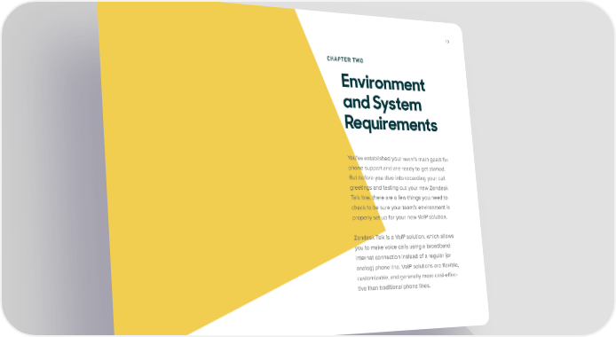 13 CHAPTER TWO Environment and System Requirements You’ve established your team’s main goals for phone support and are ready to get started. But before you dive into recording your call greetings and testing out your new Zendesk Talk line, there are a few things you need to check to be sure your team’s environment is properly set up for your new VoIP solution. Zendesk Talk is a VoIP solution, which allows you to make voice calls using a broadband internet connection instead of a regular (or analog) phone line. VoIP solutions are flexible, customizable, and generally more cost-effec- tive than traditional phone lines.