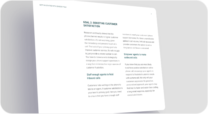 GETTING STARTED WITH ZENDESK TALK 7 GOAL 2: BOOSTING CUSTOMER SATISFACTION Research continually shows that the members to meet your customers’ phone phone channel results in higher customer support demands. For those unpredictable satisfaction—it’s not surprising, given spikes in call volume, limit call queues and the immediacy and personal touch of a provide customers the option to exit a call. That said, if your primary goal is to long queue and leave a voicemail. improve customer service, it’s not enough to just provide a phone number to call. Empower agents to make You have to make sure to strategically outbound calls design your phone support operations in a way that minimizes the major sources of If you know that you are more likely customer frustration. to achieve positive satisfaction with a phone call, encourage your agents to Staff enough agents to field respond to frustrated customer emails inbound calls with a phone call. Not only will your customers appreciate the proactive, Customers hate waiting on the phone to personalized approach, your agents may talk to an agent. If customer satisfaction is find that it’s faster and easier than crafting your team’s primary goal, then you need a long email response, especially for to ensure that you have enough staff complicated issues.