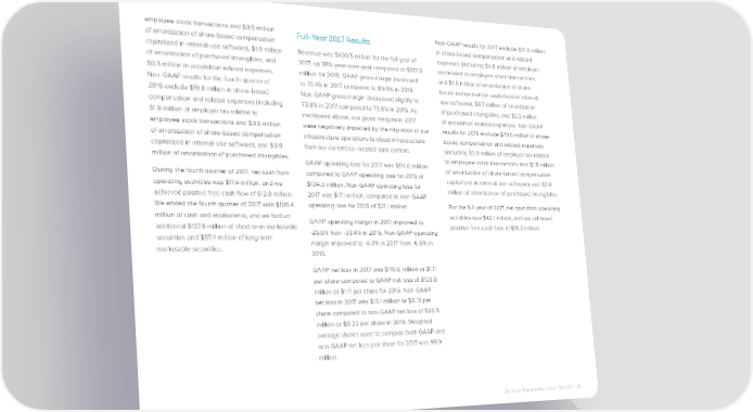employee stock transactions and $0.5 million Full-Year 2017 Results Non-GAAP results for 2017 exclude $91.6 million of amortization of share-based compensation in share-based compensation and related capitalized in internal-use software), $1.0 million Revenue was $430.5 million for the full year of expenses (including $4.8 million of employer of amortization of purchased intangibles, and 2017, up 38% year-over-year compared to $312.0 tax related to employee stock transactions $0.5 million in acquisition-related expenses. million for 2016. GAAP gross margin increased and $1.8 million of amortization of share- Non-GAAP results for the fourth quarter of to 70.4% in 2017 compared to 69.9% in 2016. based compensation capitalized in internal- 2016 exclude $19.8 million in share-based Non-GAAP gross margin decreased slightly to use software), $3.7 million of amortization compensation and related expenses (including 73.8% in 2017 compared to 73.9% in 2016. As of purchased intangibles, and $2.2 million $1.8 million of employer tax related to mentioned above, our gross margins in 2017 of acquisition-related expenses. Non-GAAP employee stock transactions and $0.6 million were negatively impacted by the migration of our results for 2016 exclude $79.5 million in share- of amortization of share-based compensation infrastructure operations to cloud infrastructure based compensation and related expenses capitalized in internal-use software), and $0.9 from our current co-located data centers. (including $3.9 million of employer tax related million of amortization of purchased intangibles. GAAP operating loss for 2017 was $114.6 million to employee stock transactions and $1.8 million During the fourth quarter of 2017, net cash from compared to GAAP operating loss for 2016 of of amortization of share-based compensation operating activities was $17.4 million, and we $104.3 million. Non-GAAP operating loss for capitalized in internal-use software), and $3.8 achieved positive free cash flow of $12.0 million. 2017 was $17.1 million, compared to non-GAAP million of amortization of purchased intangibles. We ended the fourth quarter of 2017 with $109.4 operating loss for 2016 of $21.1 million. For the full year of 2017, net cash from operating million of cash and equivalents, and we had an GAAP operating margin in 2017 improved to activities was $42.1 million, and we achieved additional $137.6 million of short-term marketable -26.6% from -33.4% in 2016. Non-GAAP operating positive free cash flow of $18.2 million. securities and $97.4 million of long-term margin improved to -4.0% in 2017 from -6.8% in marketable securities. 2016. GAAP net loss in 2017 was $110.6 million or $1.11 per share compared to GAAP net loss of $103.8 million or $1.11 per share for 2016. Non-GAAP net loss in 2017 was $13.1 million or $0.13 per share compared to non-GAAP net loss of $20.5 million or $0.22 per share in 2016. Weighted average shares used to compute both GAAP and non-GAAP net loss per share for 2017 was 99.9 million. Zendesk Shareholder Letter Q4 2017 - 13