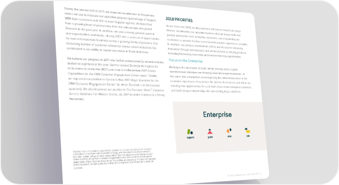 During the second half of 2017, we observed acceleration in the primary 2018 PRIORITIES metric we use to measure our upmarket progress (percentage of Support MRR from customers with 100 or more Support agents). We benefited As we move into 2018, our key priorities will revolve around two major from a growing level of productivity from the salespeople who joined themes: accelerating our upmarket business through larger deals and Zendesk in the past year. In addition, we saw a strong general uptick in greater penetration with enterprise customers, and empowering our new opportunities worldwide, closing 2017 with a solid set of opportunities customers to provide the best omnichannel customer experiences possible. for new and expanded business across a growing family of products. Our In addition, our product development efforts are focused on delivering increasing number of customer references across certain industries has innovation through new products and enhancements to existing products, contributed to our ability to repeat successes in those industries. including harnessing more data and machine learning opportunities. We believe our progress in 2017 was further underscored by several industry Focus on the Enterprise analyst recognitions in the year. Gartner scored Zendesk the highest for No longer the obsession of small, nimble startups alone, digital its business to consumer (B2C) use case in its December 2017 Critical transformation initiatives are changing even the largest businesses. At Capabilities for the CRM Customer Engagement Center report.* Earlier, the same time, enterprises are recognizing the critical importance of the we improved our position in Gartner’s May 2017 Magic Quadrant for the customer experiences they deliver. We believe these trends and others are CRM Customer Engagement Center* (in which Zendesk is in the Leaders creating new opportunities for us to both attract more enterprise customers quadrant). We also improved our position in The Forrester Wave™: Customer and build deeper relationships with our existing large customers. Service Solutions For Midsize Teams, Q2 2017 (in which Zendesk is a Strong Performer). Enterprise *Gartner does not endorse any vendor, product or service depicted in its research publications, and does not advise technology users to select only those vendors with the highest ratings or other designation. Gartner research publications consist of the opinions of Gartner’s research organization and should not be construed as statements of fact. Gartner disclaims all warranties, expressed or implied, with respect to this research, including any warranties of merchantability or fitness for a particular purpose. Zendesk Shareholder Letter Q4 2017 - 5