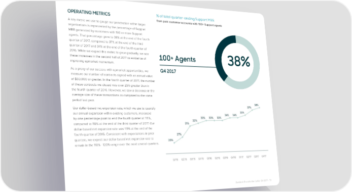 OPERATING METRICS % of total quarter-ending Support MRR from paid customer accounts with 100+ Support agents A key metric we use to gauge our penetration within larger organizations is represented by the percentage of Support MRR generated by customers with 100 or more Support agents. That percentage grew to 38% at the end of the fourth quarter of 2017, compared to 37% at the end of the third quarter of 2017 and 34% at the end of the fourth quarter of 2016. While we expect this metric to grow gradually, we see these increases in the second half of 2017 as evidence of 100+ Agents 38% improving upmarket momentum. As a proxy of our success with upmarket opportunities, we Q4 2017 measure our number of contracts signed with an annual value of $50,000 or greater. In the fourth quarter of 2017, the number of these contracts we closed was over 25% greater than in the fourth quarter of 2016. However, we saw a decrease in the average size of these transactions as compared to the same period last year. Our dollar-based net expansion rate, which we use to quantify our annual expansion within existing customers, increased by one percentage point to end the fourth quarter at 119%, compared to 118% at the end of the third quarter of 2017. Our dollar-based net expansion rate was 115% at the end of the fourth quarter of 2016. Consistent with expectations in prior quarters, we expect our dollar-based net expansion rate to remain in the 110% - 120% range over the next several quarters. Zendesk Shareholder Letter Q4 2017 - 10