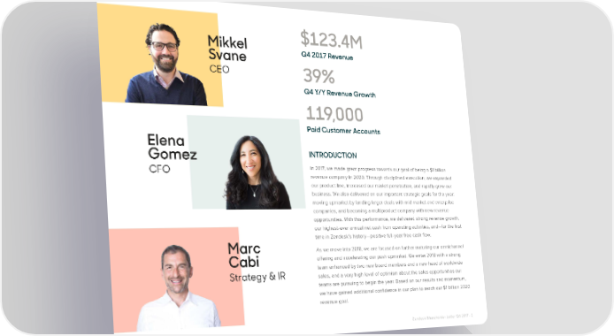2 Mikkel Svane CEO Elena Gomez CFO Marc Cabi Strategy & IR Q4 2017 Revenue Q4 Y/Y Revenue Growth Paid Customer Accounts INTRODUCTION In 2017, we made great progress towards our goal of being a $1 billion revenue company in 2020. Through disciplined execution, we expanded our product line, increased our market penetration, and rapidly grew our business. We also delivered on our important strategic goals for the year: moving upmarket by landing larger deals with mid-market and enterprise companies, and becoming a multiproduct company with new revenue opportunities. With this performance, we delivered strong revenue growth, our highest-ever annual net cash from operating activities, and—for the first time in Zendesk’s history—positive full-year free cash flow. As we move into 2018, we are focused on further maturing our omnichannel offering and accelerating our push upmarket. We enter 2018 with a strong team enhanced by two new board members and a new head of worldwide sales, and a very high level of optimism about the sales opportunities our teams are pursuing to begin the year. Based on our results and momentum, we have gained additional confidence in our plan to reach our $1 billion 2020 revenue goal. $123.4M 39% 119,000